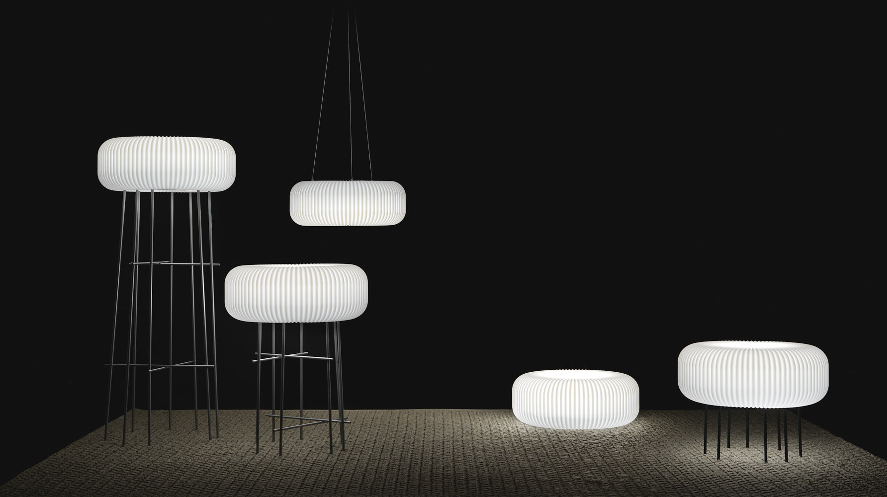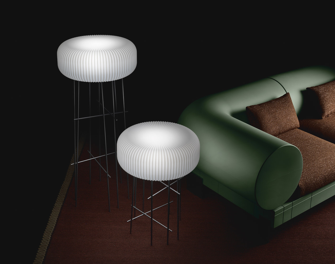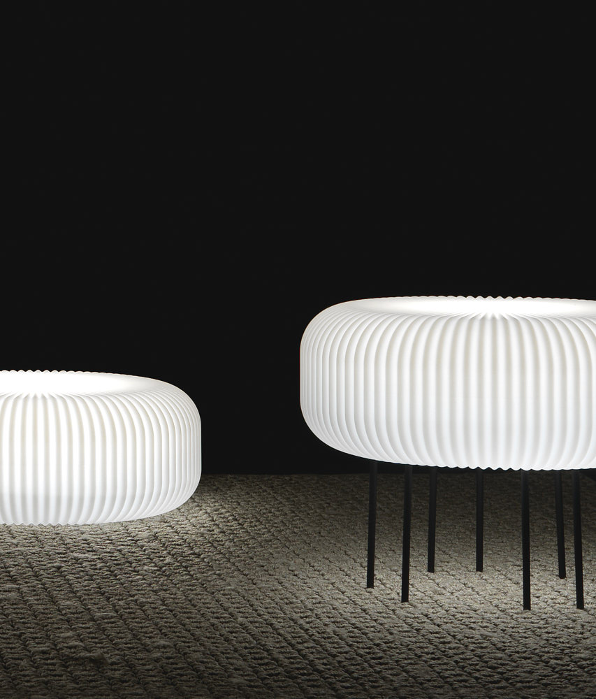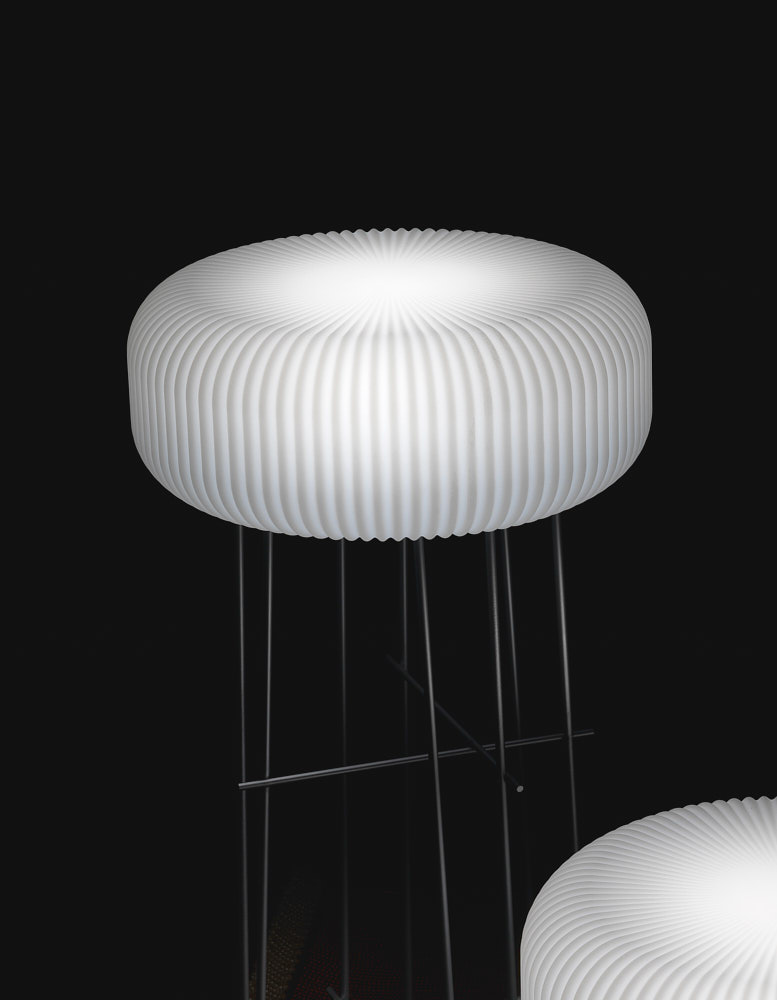 ELLY rappresenta le forme suggestive delle meduse luminose: filiformi zampe in metallo come tentacoli fanno da base a sinuosi e ondulati corpi luminosi che evocano l'eleganza della creatura marina. Queste lampade in polietilene catturano l'essenza eterea e incantatrice di queste creature marine, portando la loro grazia e bellezza negli spazi sia privati che contract.